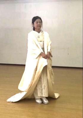 ドレスでの歩き方も後方重心で、足が先に出て重心移動です。