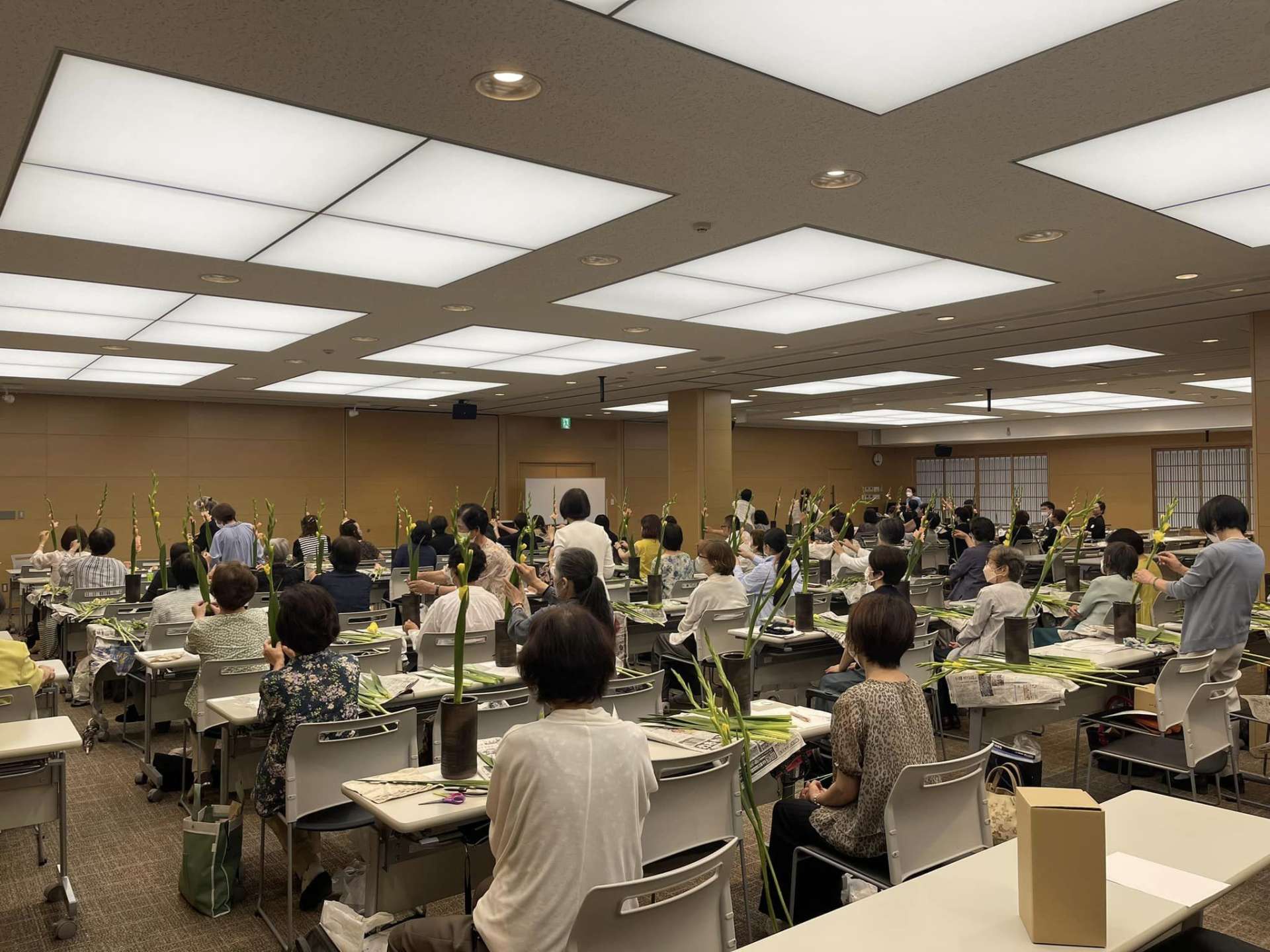 大和未生流:夏季講習会 2023/07/09 大和未生流・夏季講習会 関東方面など、ご遠方からもお越しです。 4代目・須山法香斎お家元による講義に実技 グラジオラスの葉組 講習会で勉強したお花はそのまま レスティ唐古・鍵へ生け込みに・・・・ 華道