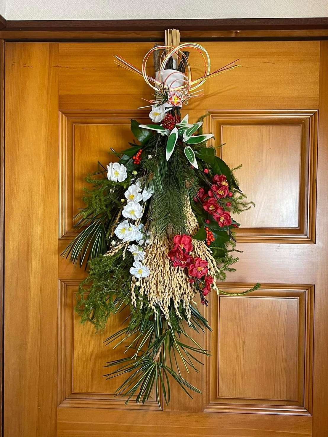 友人にもらったヒカゲカズラと、家にあった高野槙と千両とで蓬莱飾りを作り、水引を結んでみました♪