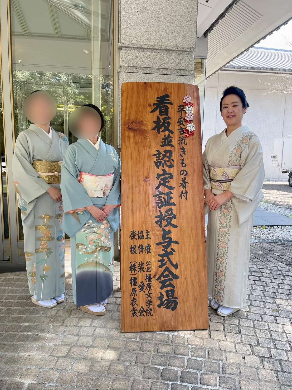 看板並認定証授与 2025/03/22 着付け教室の生徒様が、この度 看板と上級講師資格をとられました。 講師養成は、私が所属する後手結びの着付け学院 平安古流きもの着付け学院のカリキュラムで行っております。 留袖他装15分 振袖他装20分 上級講師の方はこれから看板取得に向けて頑張ってお稽古です。 看板を取られた方は、着付師として活動されますが 教室には残ってくださり色々な着付けを習いたいと。。 嬉しいですね。 前結び着付けや着物ドレスなど、沢山あるので こちらはゆるりとやっていきましょう♪ 着付け